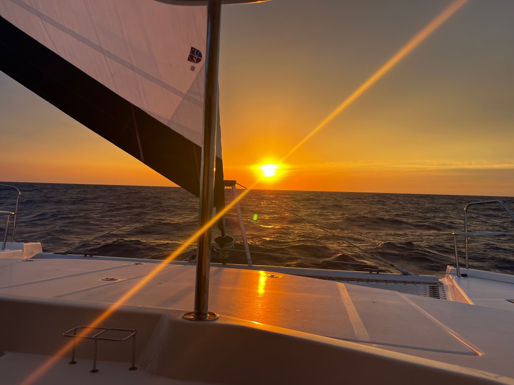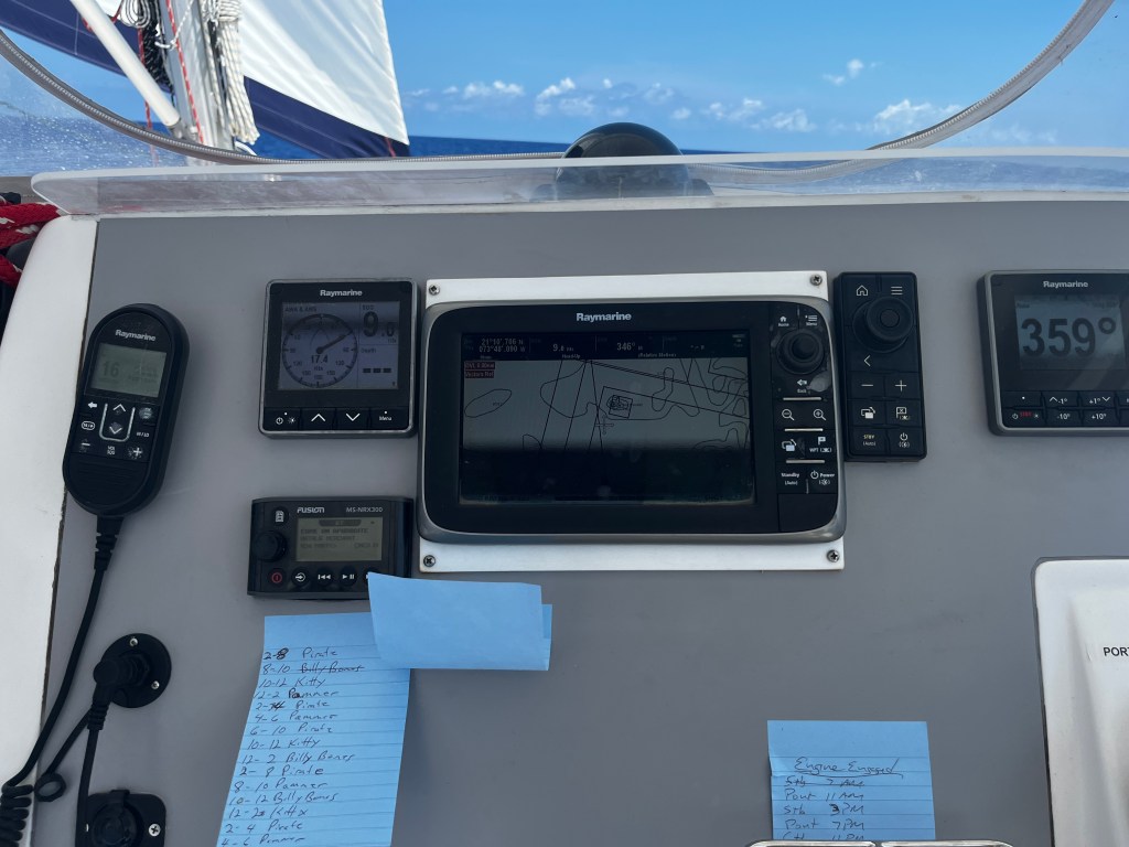 #1 Crew (Ryan and Nate) headed back to Boston and the next day Billy’s sister Pam and our hired Captain – Pirate Mike Brown – joined to start the 2300 mile journey home. We had a great dinner at a local spot in St. Thomas then departed the next day just east of the St Thomas airport to Brewers Bay where Captain Mike took us through safety procedures and even ran us through a real (unexpected) Man Over Board drill! We passed (barely) as we actually got him back on board!