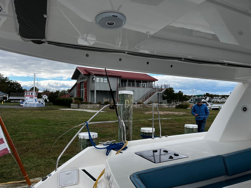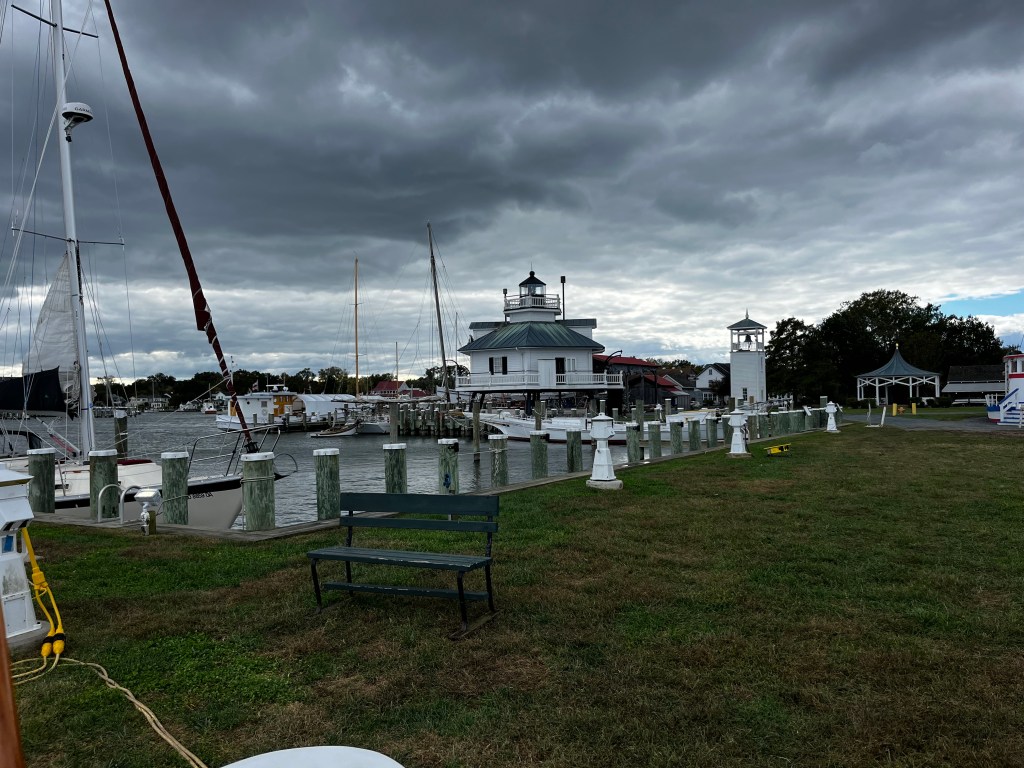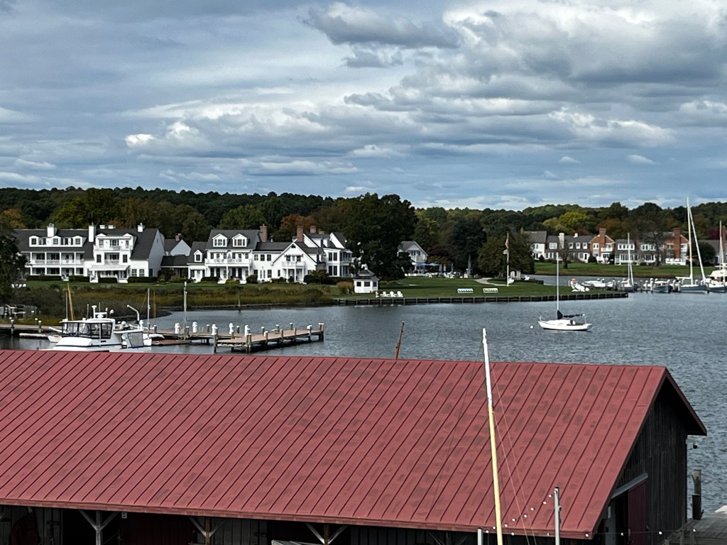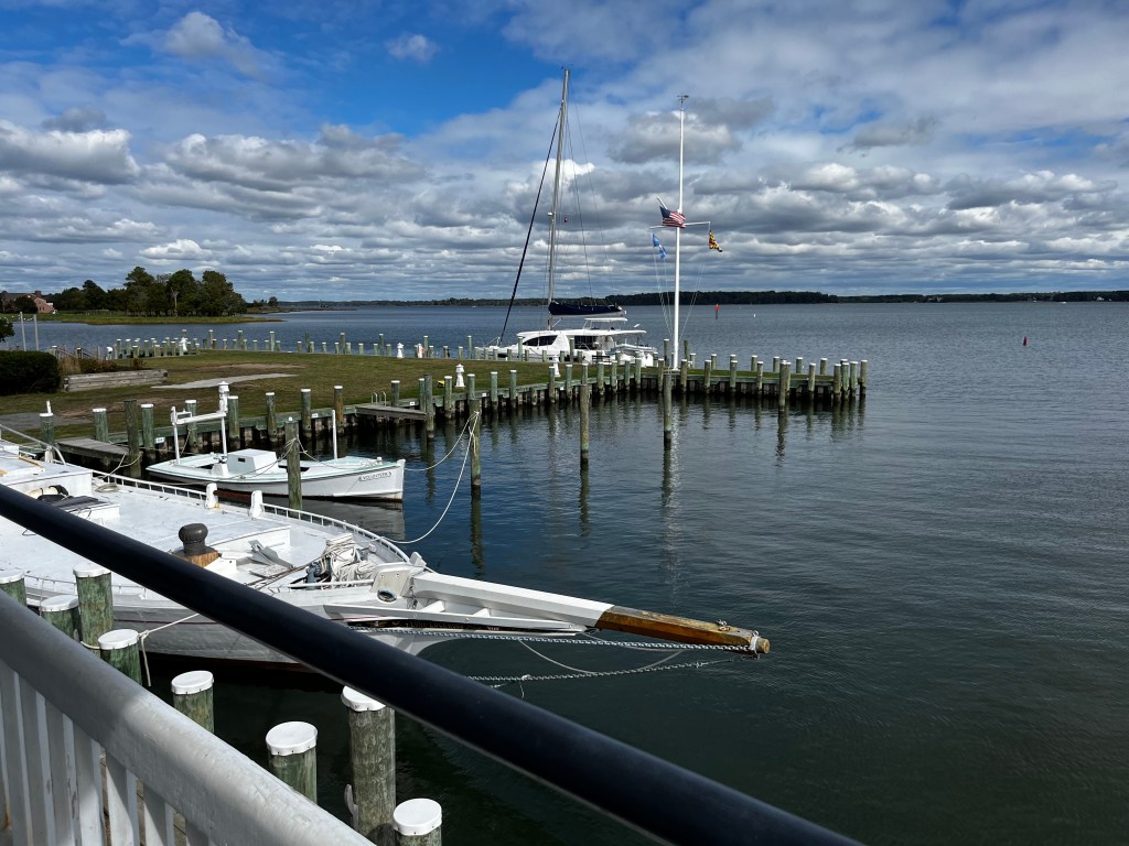 We hung out on the mooring Saturday as it was a rainy day – and headed for St. Michaels (Marylands East Shore) Sunday morning to visit with our friends the Hecklers. It was a breezy day, blowing 25 knots most of the day but we were down wind most of the time and made good time through the Chesapeake and then up and around into St. Michaels. The Hecklers had arranged for us to stay at the Chesapeake Bay Maritime Museum which was an easy approach and tie up. It was fun to be on the museum campus – several visitors came by and checked out Carried Away as if she was a museum exhibit! John and Kim gave us an amazing tour of St. Michael’s where they send most of their free time and treated us to a wonderful dinner at the Bistro (yum!). We then had late night cocktails around the fire-pit at the Inn at Perry Cabin which is where Wedding Crashers was filmed (one our favorite movies!). The surrounding area is simply amazing – so much coastline, open spaces and farms. It was a wonderful 2 day stop.