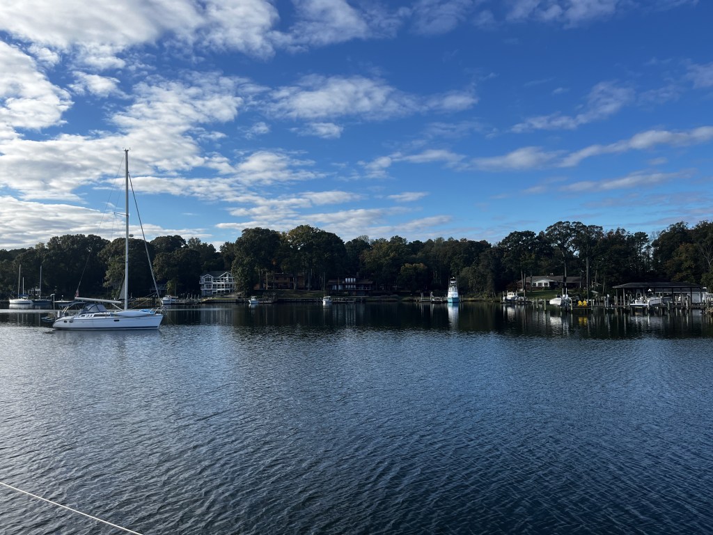 We left St. Michaels for the Solomon Islands – had a wonderful following wind the first half of the day and made great time. We tucked up into Mill Creek in a quiet anchorage surrounded by beautiful homes – it felt like being on a lake it was so calm and still – and had a quiet dinner on board. While we hoped to stay a couple of days there, the weather forecast is for strong winds from the South (exactly where we are headed) starting tomorrow so now we’re heading to Deltaville VA and will be spending the weekend at a marina in Lancaster VA to get the new batteries installed. Next week we’ll head south and begin final preparations for the Hampton to Antiqua passage! More in passage prep in the next blog!