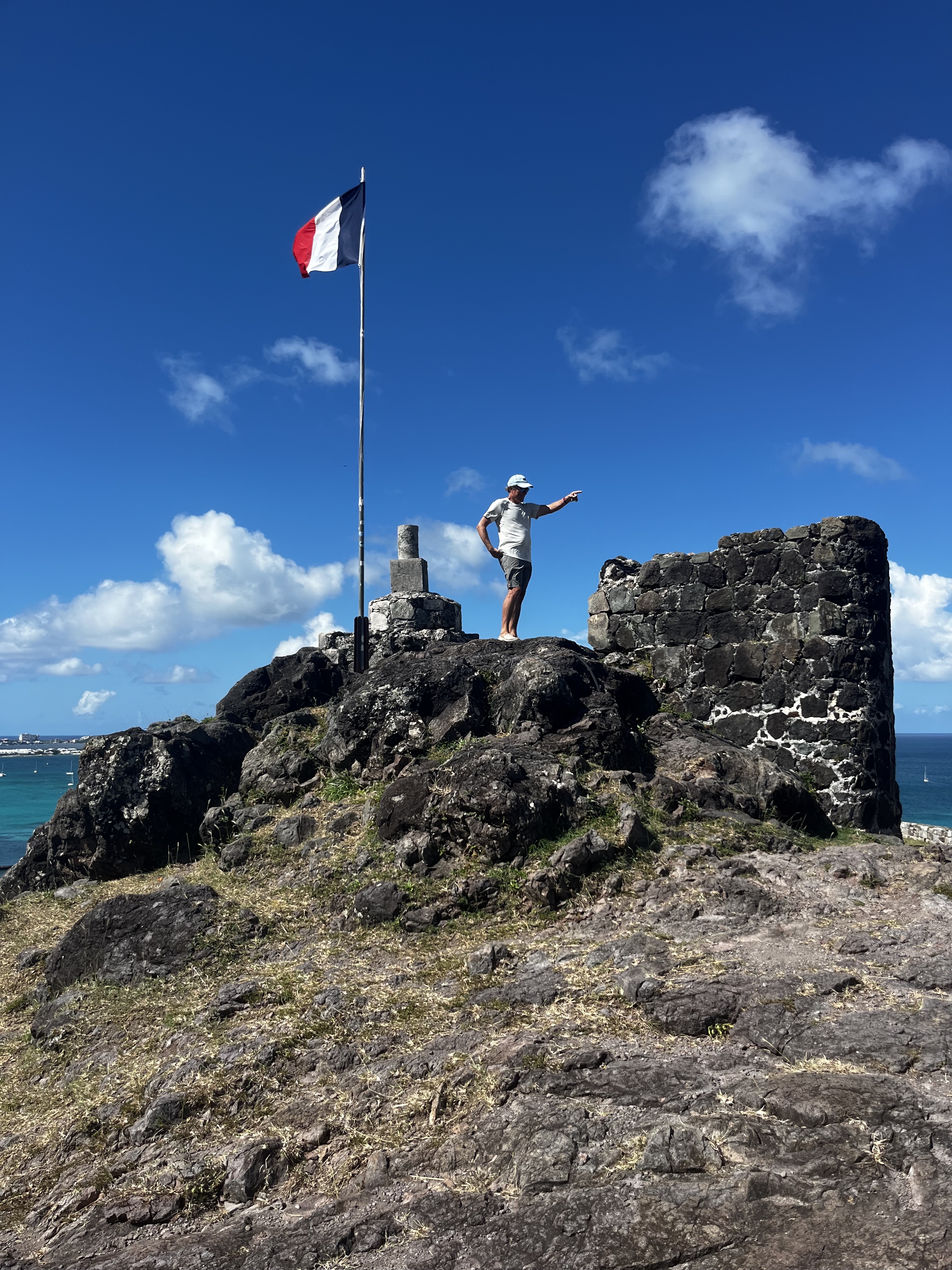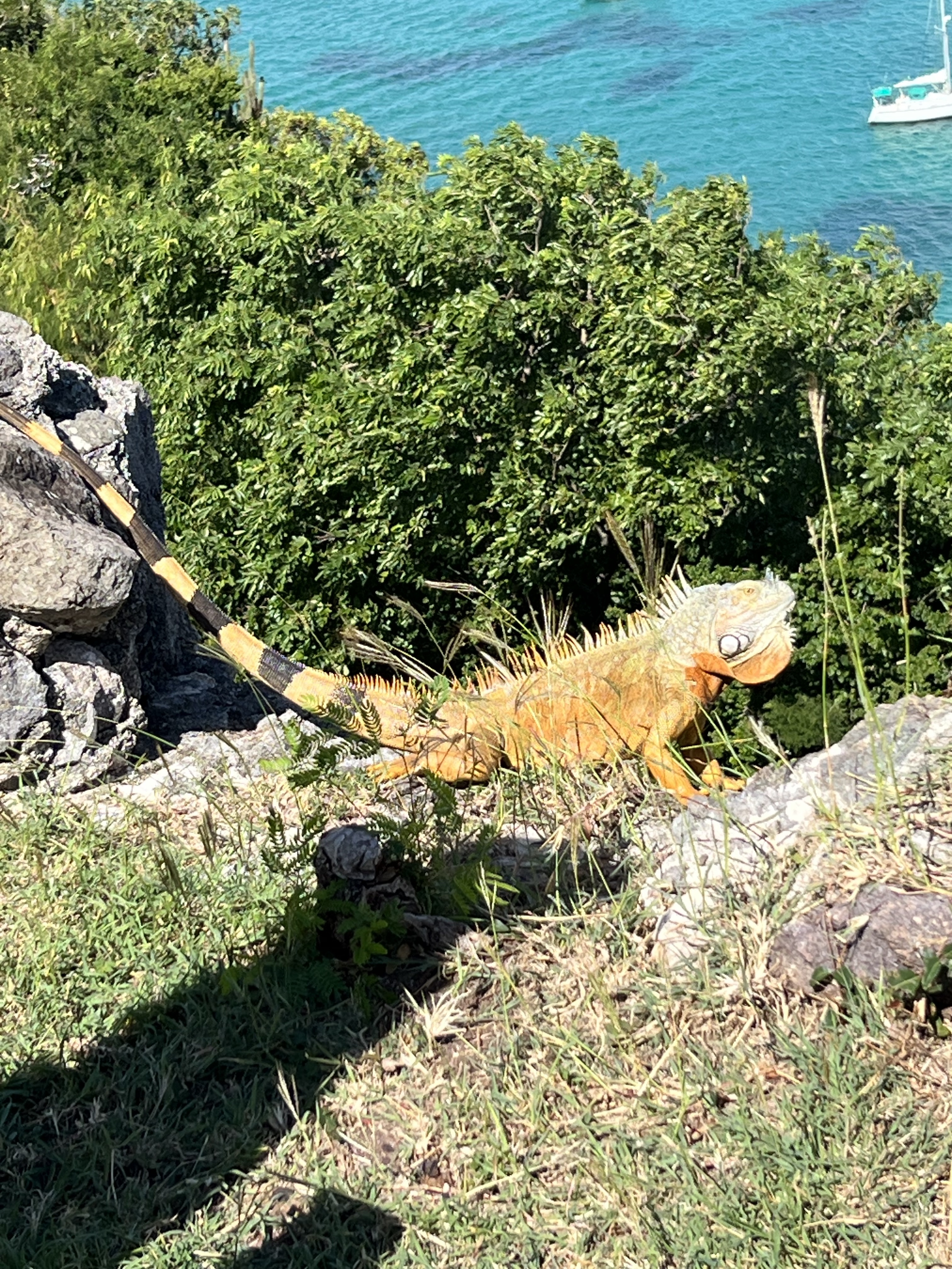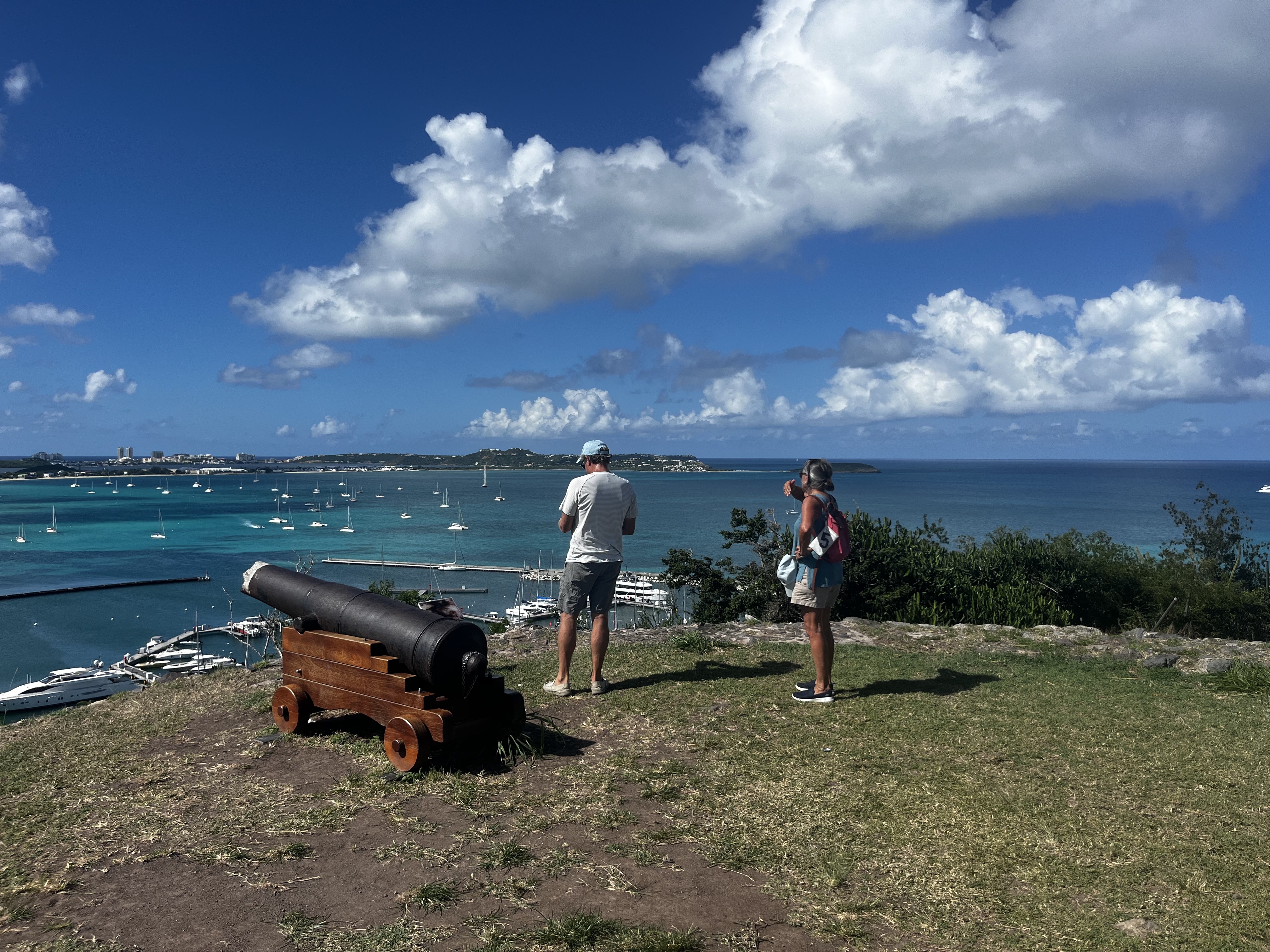 Finally we headed to St. Martin – our final stop with Beth & Steve. It was windy and wavy but a good quick sail (25 miles) and we pulled into Marigot Bay where we dropped an anchor to be greeted promptly by the port authority boat (very friendly) who told us that we had to check in at the port authority in Galisbay – which is an active shipping port with huge barges and 18 wheelers all around – not at all cruiser friendly. Fortunately, Beth and Steve stayed with the dingy as the only thing to tie to was an active loading dock full of sharp rebar. We found the office and officially “checked in” - while the people were nice not an easy check in. We then were free to explore Marigot, which has a busy downtown with ferries that run to Anguilla and St Barts and where buses of cruise ship passengers come for the day. They were decorating for Christmas with a big tree in the town center and it was fun to see. Port Fort Louie looks over the town and bay and that was an easy and fun hike – pretty impressive views and lots of Iguanas (Mitzy get your gun!). Of course there are many French restaurants which we thoroughly enjoyed. Since its a bit busy, when the weather was right we chose to head Grand Case which is a lovely coastal town just east of Marigot with tons of restaurants and shops and several fun spots right on the beach. While the dutch side is known for beaches that the big planes take off right over – in this little town there is a small airport where planes fly just above the rooftops to land – such fun to watch and hear! This was definitely one our favorite stops so far.