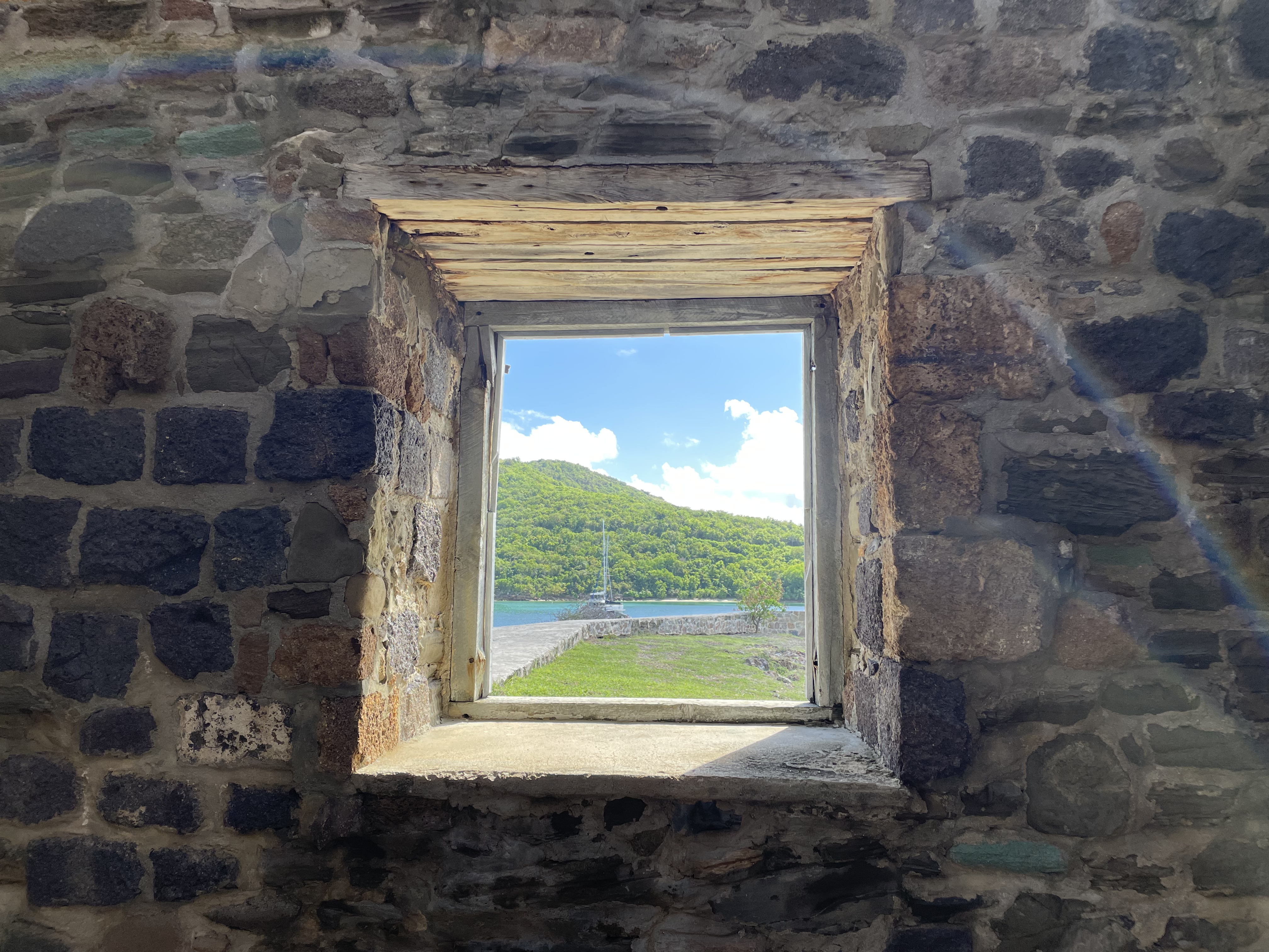It’s impossible. Absolutely impossible to share all the cool experiences and photos from our first few weeks in the Caribbean and keep it a length you will actually want to read! But, I’ll do my best. Having arrived from Hampton VA to Antigua we settled into Nelsons Dockyard in English Harbor with all the Salty Dawgs who had made the trip (over 80 boats!). Karl had to head home as he was heading to Europe for Thanksgiving family trip – but we were able to do a little exploring around English Harbor and Lord Nelson’s Forts before he left, and Scott’s wife Dot arrived to spend a week with us exploring Antigua. (photo cred to Karl for the window shot – loved that one!)