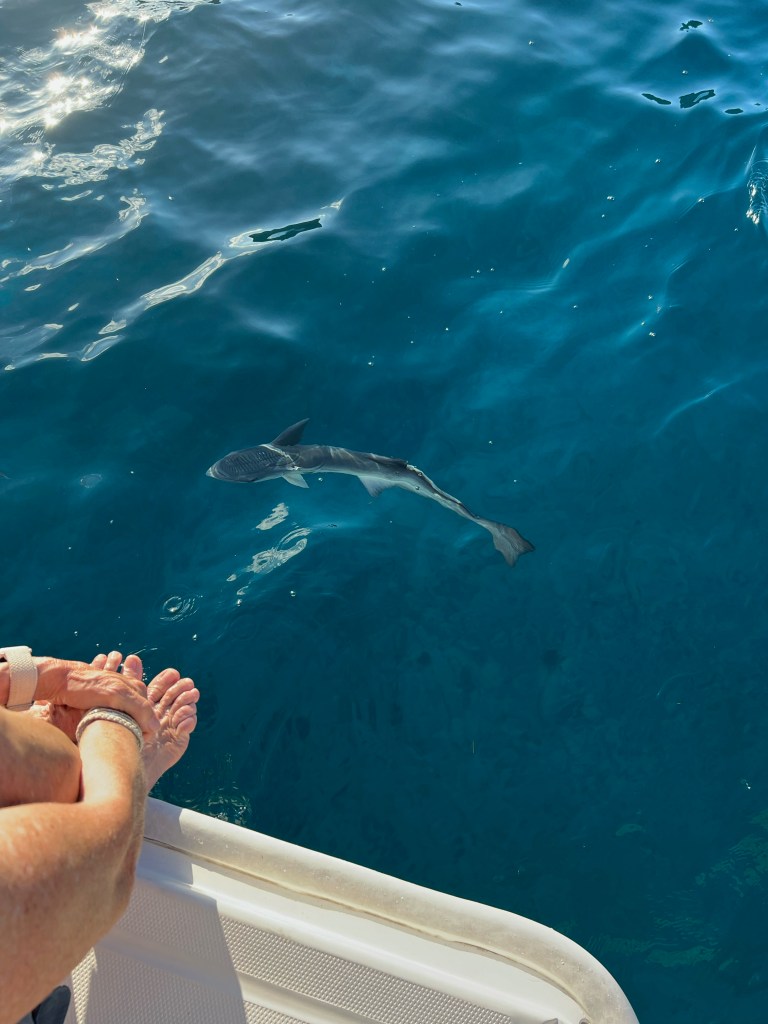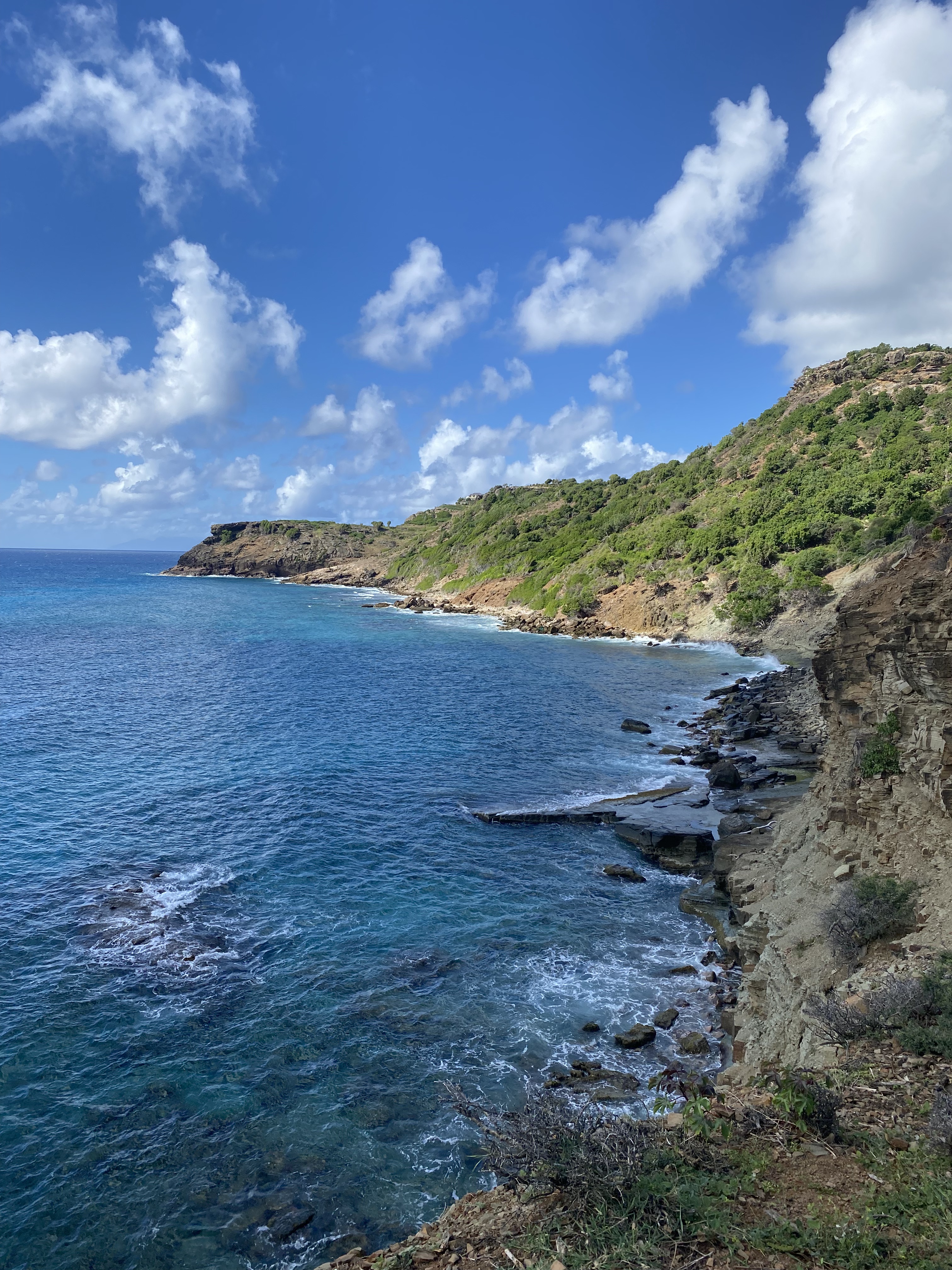 While on the boat in Falmouth harbor on November 22nd we heard some horns going off around 4 pm and looked to see a little Opti sailing out of the main harbor with an entourage. Turns out a young 14 old named Carrack Jones (no relation ;)) who is an accomplished Opti sailor. He was taking off to beat the world record of sailing distance in an Opti – he was heading to St. Martin (it’s over 100 NM!) It was fun to watch him pass and he waved with his family, friends and supporters escorting him out. [Note: he made it! Took him 30 hours – but he set a new world record] We headed out from Falmouth harbor the next day and stopped for a couple of nights at Jolly Harbor on the western side of Antigua which was quiet, but good fun. We then sailed a longer leg (~75 miles) to St. Barths, which took most of a day and was a little lumpy. Billy caught a fish, but it got away, again. We arrived late in the day and got a nice anchor spot just off Les Gros Ilets where we could swim over and snorkle the rocks. We had some remora fish (they look a bit like sharks but aren’t) who were very friendly and actually attached themselves to the keel and road along with us for a few days.