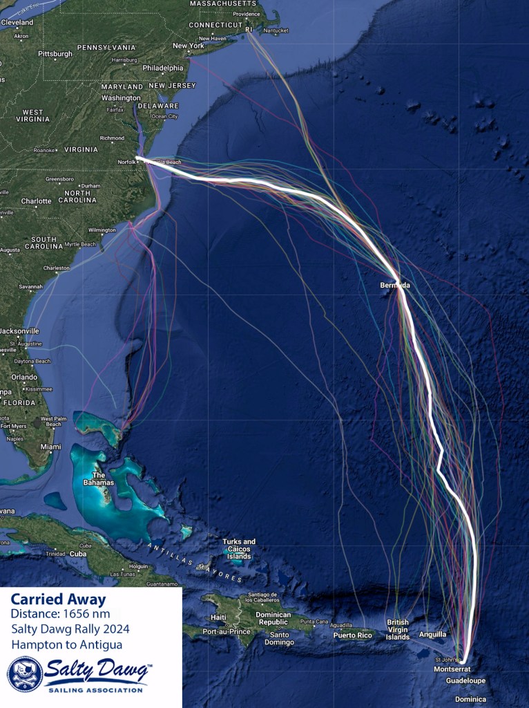 Back on October 30th we got the thumbs up from the weather router Chris Parker that it was a good window to head to Antigua. With our amazing crew, Karl and Scott, we dropped the lines from Bluewater Marina and headed off for the ~11 day passage. It was Halloween morning and we made our way out through Hampton Roads with about 60 other Salty Dawg boats. As we made our exit, we passed an incoming US Navy submarine – this was our first time seeing a submarine and it was so cool. We had to stay 500 yards away as she ghosted by heading into the Norfolk Naval base. The winds were relatively mlld as we headed out across the entrance to the Chesapeake, we set the sails and headed due east.