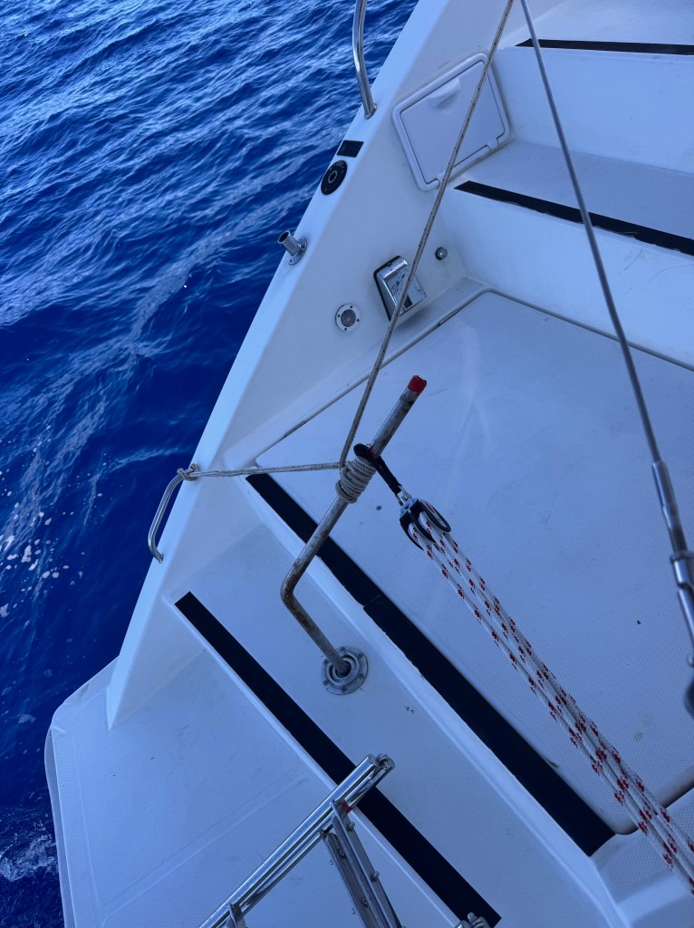While the sailing was fine and we were making good time, about a day out of Bermuda we found that the port rudder fix wasn’t holding. It was determined that the best solution was to disconnect the port rudder entirely, secure it and then use the starboard rudder alone to reach Antigua (with 900 more miles to go). It certainly was nice to have two rudders! We also appreciated the Salty Dawg Shoreside team who tracked the situation and provided support. The crew was amazing, stayed calm and in the face of a big challenge worked calmly to secure the port rudder using the emergency tiller and some unique tie offs – it wasn’t pretty, but it worked!