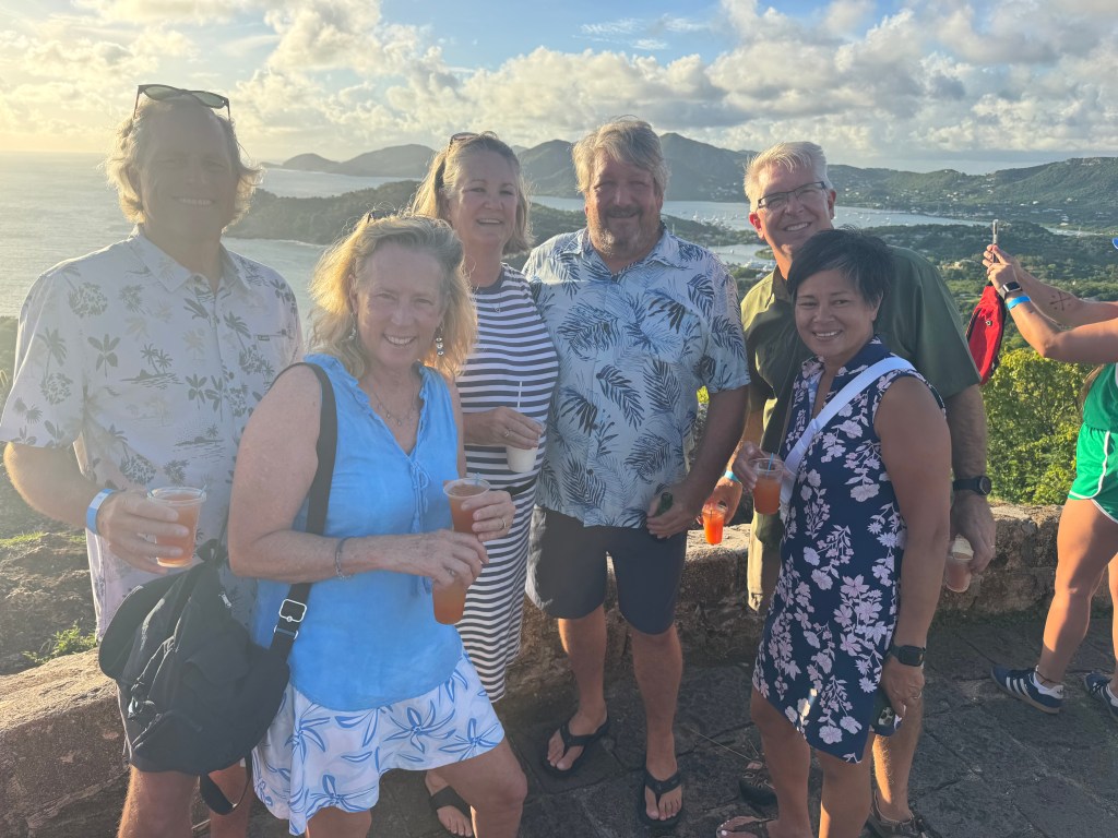When we returned from Casey & Garretts wedding back in November, Carried Away was still tied up “stern to” (that’s parked in backwards) at Nelson’s Dockyard right next to our new friends Todd & Joy on their Outremer 51 Alegria (which means Joy in Italian). We joined in on several of the Salty Dawg activities which included hikes, beach gatherings, cocktails and dinners as well as a “TOT” which is a British Naval tradition. It happens everyday at 6pm. They share records of British Naval history from the day, toast the king and throw down a big (3 oz) shot of harsh rum in one gulp. My dad was a British officer and my uncle was a captain in Her Majesties Royal Navy – so I felt compelled to partake!