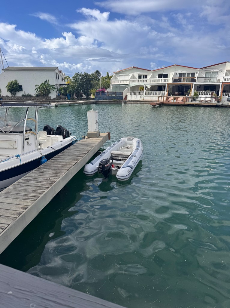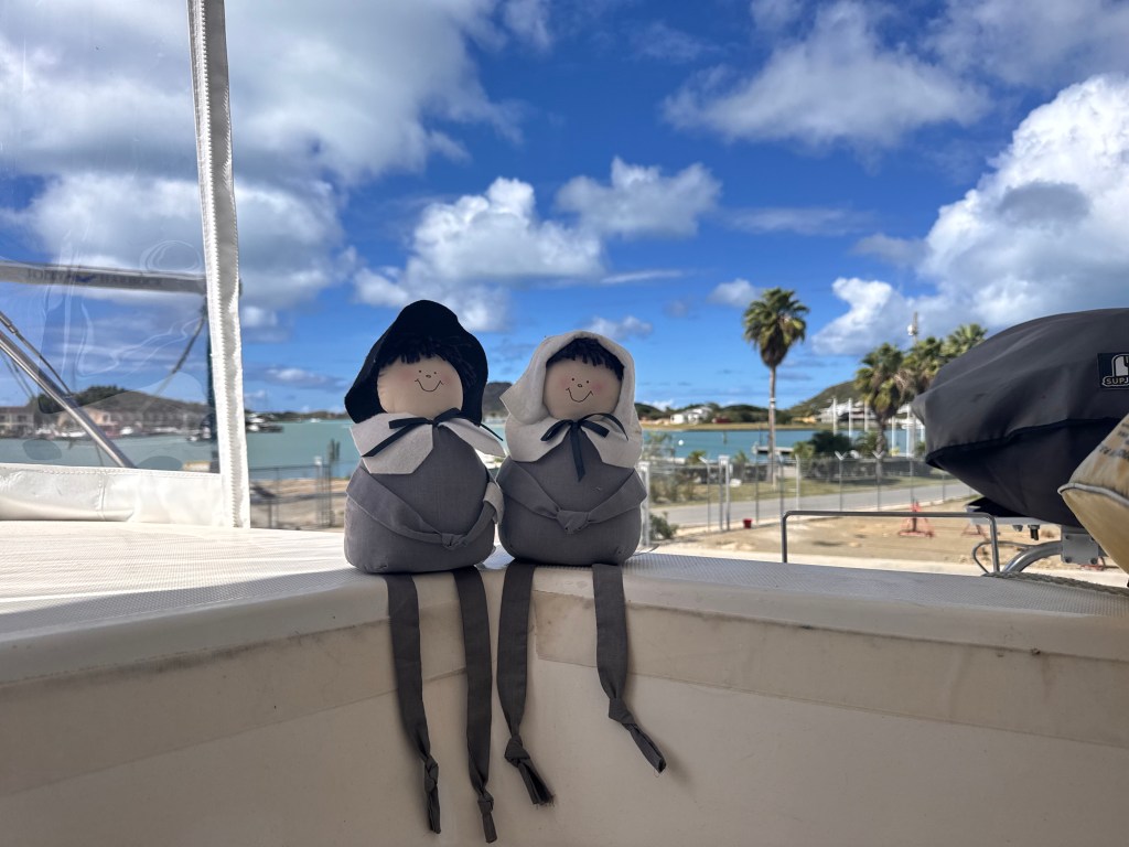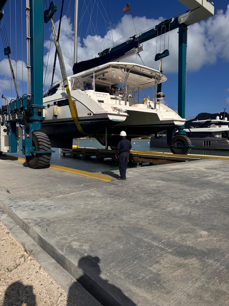 It’s was great meeting new Dawgs and reconnecting with the folks we had met last year, but then it was time to head up to Jolly Harbour to get our leaky rudders fixed. The marina there has a boat lift big enough (width-wise) to lift catamarans and they hauled us out on the Tuesday of Thanksgiving week. They don’t allow you to stay on the boat while it’s in the yard so we rented a little harbor cottage for a few days which allowed us to go back and forth to the boatyard via our dingy – it was a really fun way to commute!
