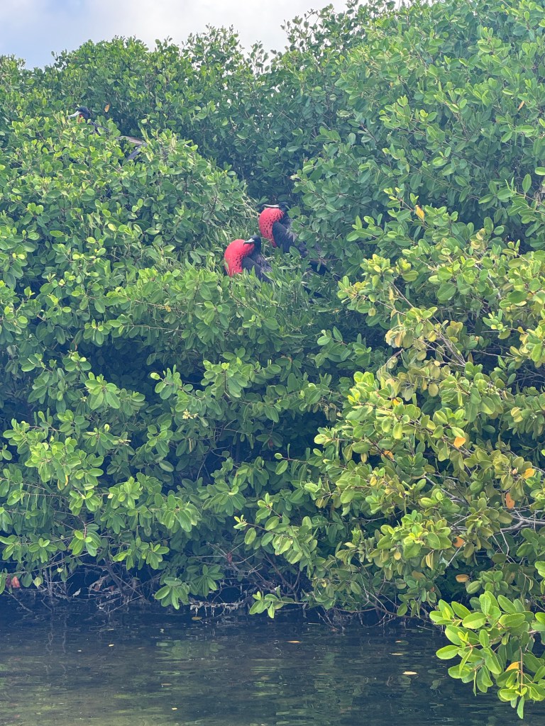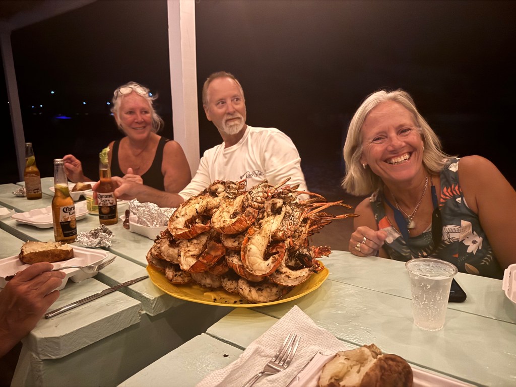 The main attraction beyond the beach is the Frigate Bird Sanctuary which is the largest frigate colony in the western hemisphere. Some Salty Dawgs had booked a tour and invited us to join. Our tour guide Solomon took us out to the sanctuary on his 22 ft skiff. It’s the only way to get there. He told us all about the birds, their mating habits and how the males migrate to the Galapagos and back – without stopping! Apparently they can sleep for moments at a time while flying. We finished the day with lobster dinner on the beach hosted by Enoch at his little beach shack. Two lobster tails and one baked potato per person – that’s it and it was so good!