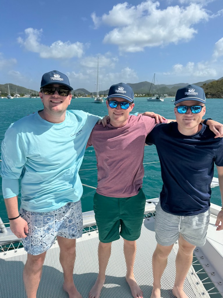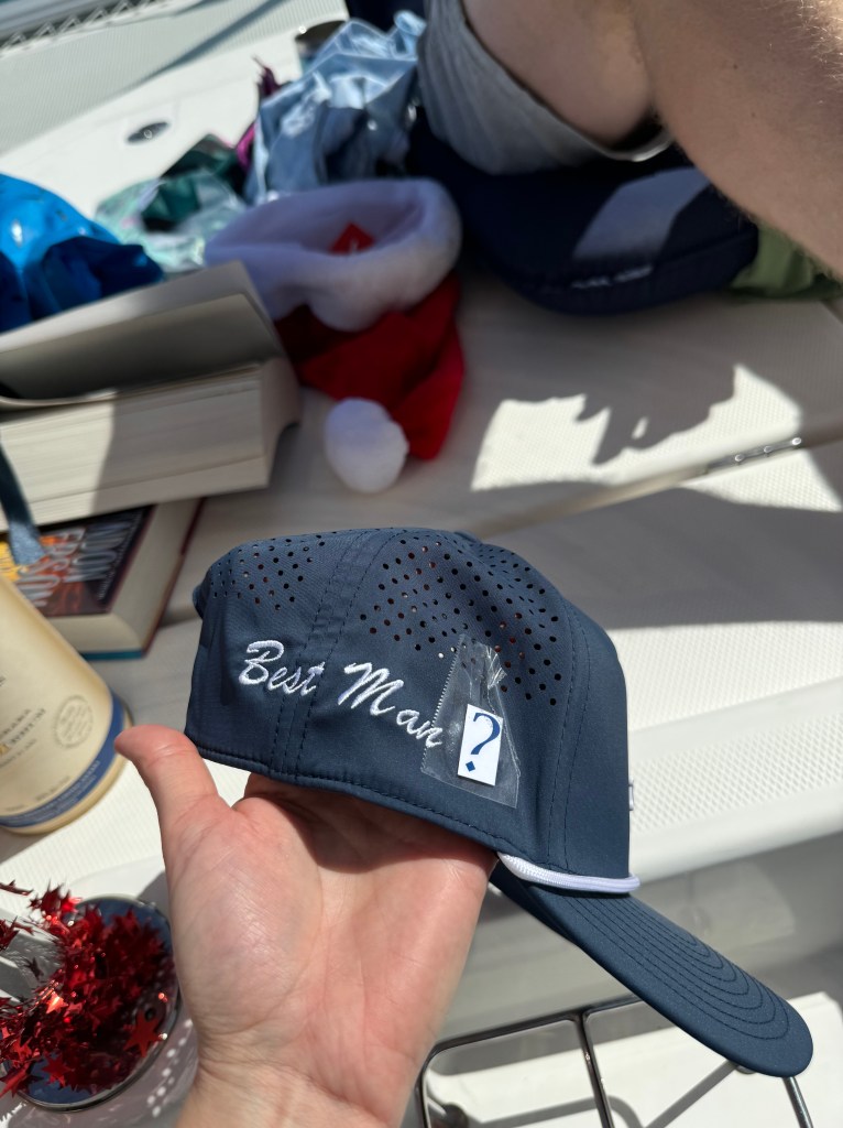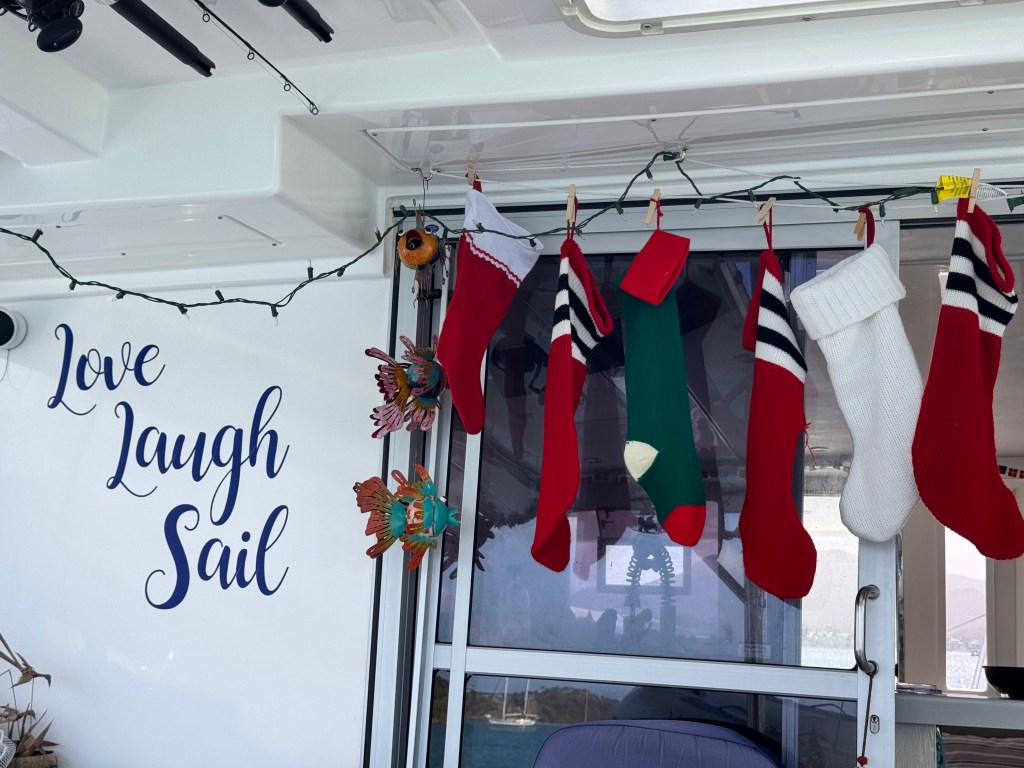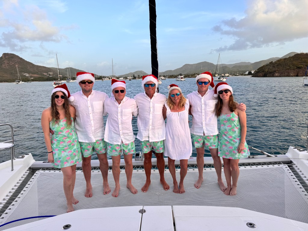 Christmas Day was very relaxing. We opened stockings on the bow, everyone had bought one gift for everyone else. My favorite was when Trevor gave Willy and Ryan golf hats with “Best Man” embroidered on the side – this was his way of asking them both to be his best men. They both said yes which of course led to several conversations on how they will approach their big speech in November. We had a nice long walk on Jolly beach and then had Christmas dinner on board. Very merry indeed!