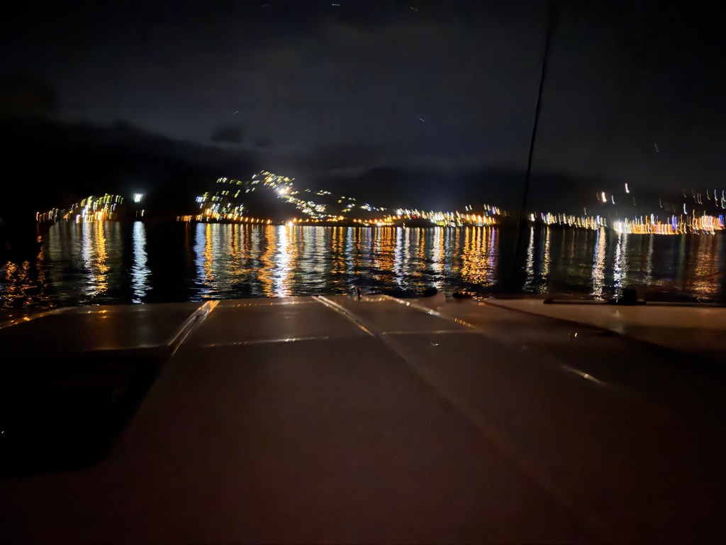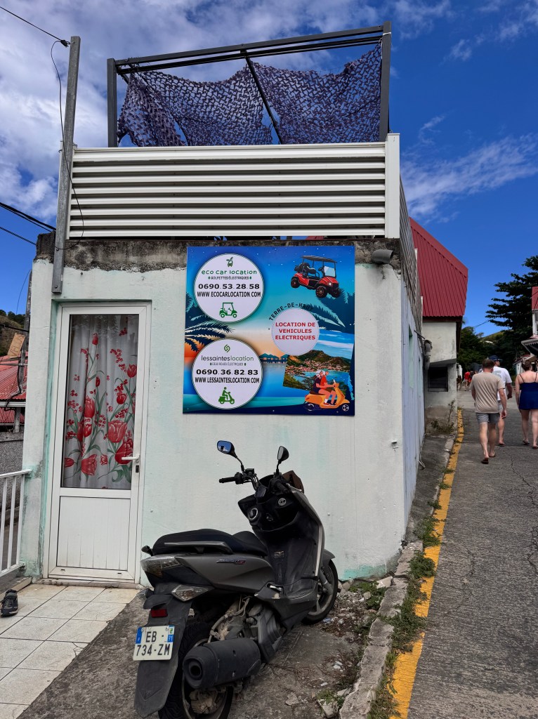 We quickly cleared out of customs and readied the boat for departure – we left at about 5:30 pm and had a glorious sail (light winds, bright night skies and calm seas). We took 2 hour shifts – with 2 people on the helm at all times. With 7 of us, it made it pretty easy. We moved right along, almost too fast as we had to slow down when we approached the islands as it was still dark. As the skies lightened we motored in and grabbed a mooring close to the town of Terre-de-Haut.