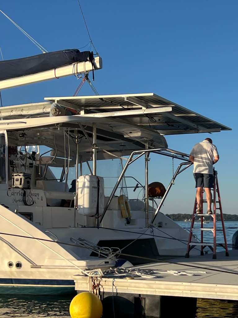 After all that fun, it was time to focus on getting ready for Caribbean Season #3. While maintenance and planning always keeps us busy – this year included Bill’s Big Solar Project (seems like it needed an official name). The solar power will allow us to rely less on the generator and provide us plenty of power. Billy did all the research and was project manager – it was a lot of work. He had great input from our friends the Bells who had installed a similar system on their Leopard 48 (SV Pilar). The big part of the project was actually the frame that holds the solar panels onto the boat. It’s typically quite expensive and can get massive (not what I wanted). So Billy worked with his childhood friend Donnie Tucker who has owned a machine shop with his wife Tina for over 30 years (a great story of hard work and great success). Billy sent the frame design to Donnie who got the aluminum, cut and assembled it. Billy loved spending a few days working in the shop and while Donnie ended up giving Billy an “A-” for his work (I think the long term friendship got him a half grade improvement) they both had a blast. Thanks too to Scott F & Jack for a full days work to help get the system loaded onto to the boat and attached to the coach roof and to Todd & Heidi for letting us use your dock so we could access the transom.