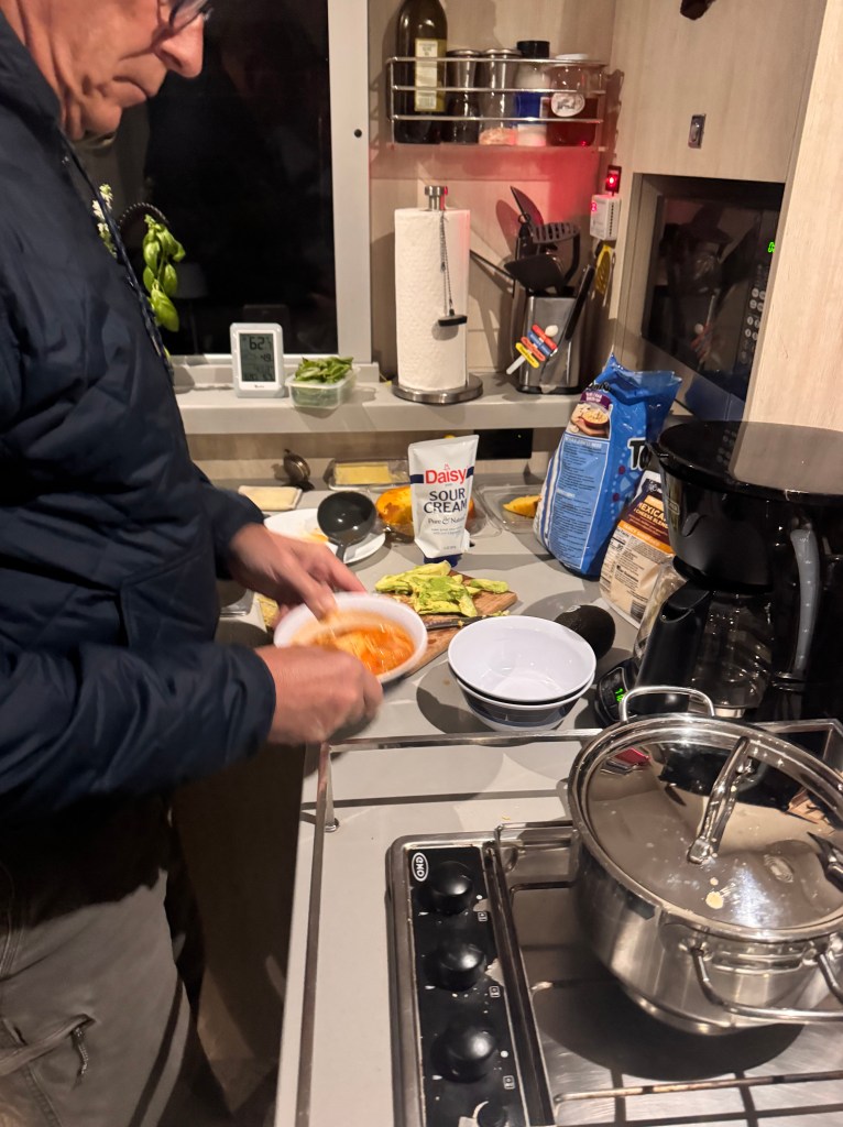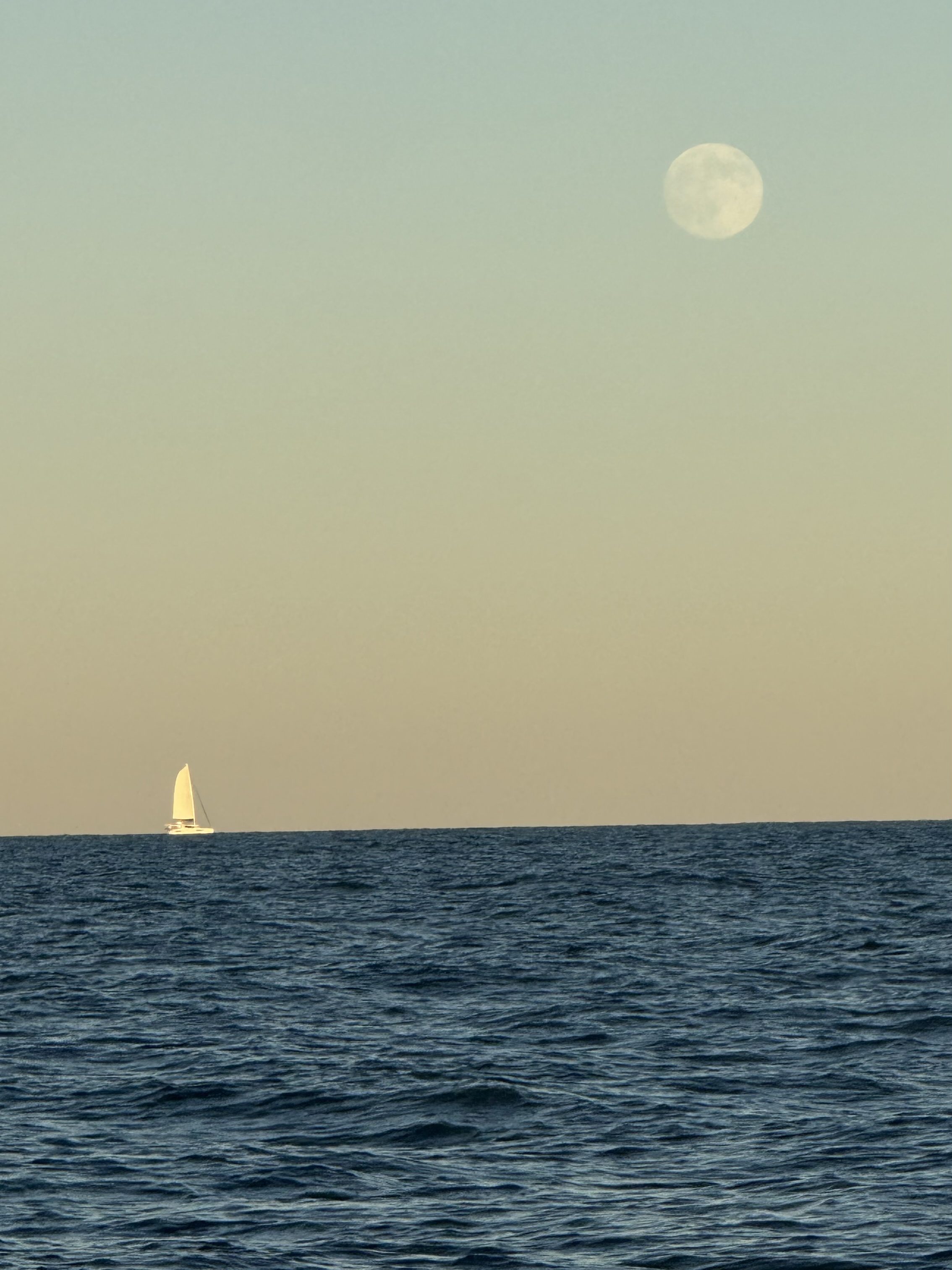 As the evening proceeded the winds and seas built. It was a very bumpy and rough ride for about 24 hours. In the middle of the night our forecaster, Chris Parker, confirmed it was going to be worse (more wind) and longer than he had thought. The bit of good news was that there was a beautiful big full moon – so visibility was very good. The waves were so big and the winds so strong that we bounced around all night and the waves hitting the hull made it hard to sleep, so by morning everyone was pretty tired.