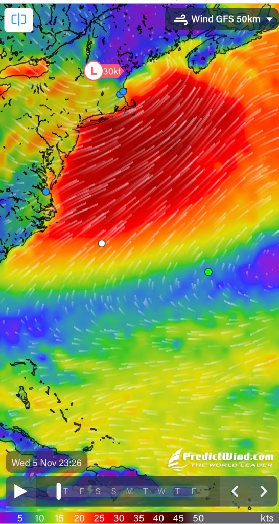 While the first night was easy and uneventful, not so night #2! There was a cold front coming off of the east coast and we had hoped to get far enough south of it to be in the “milder” winds (less than 30 knots) – but that didn’t quite work out and we found ourselves (as did many of the Dawgs) in 30-35 knot winds with gusts to 38 knots. See the graphic below from the Predictwind app which shows the weather system and associated wind color coded: green and orange is mild and good – red is rough. We are the white dot.