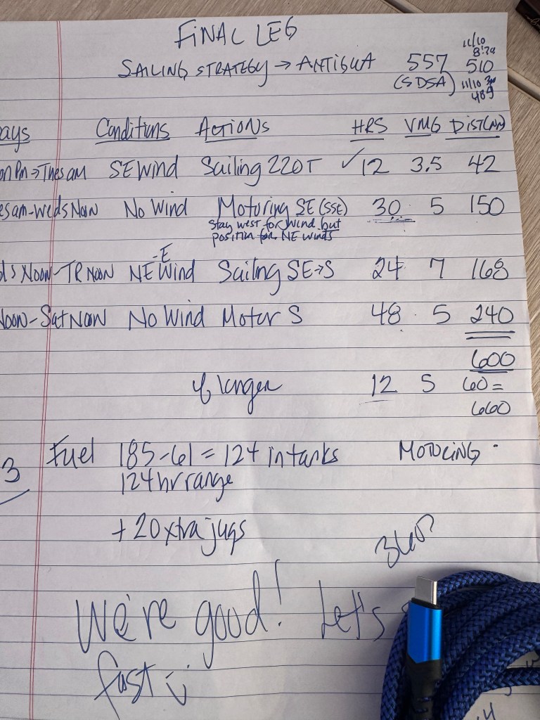 The balance of our passage was a challenge only due to the light winds. For several days we were constantly calculating fuel consumption to make sure we had enough to make it to Antigua without having to bob around in the Atlantic waiting for the wind to fill in. On day 9 the wind filled in just enough to turn off the engines and we sailed the rest of the way to Antigua with plenty of fuel left in the tanks. Phew!