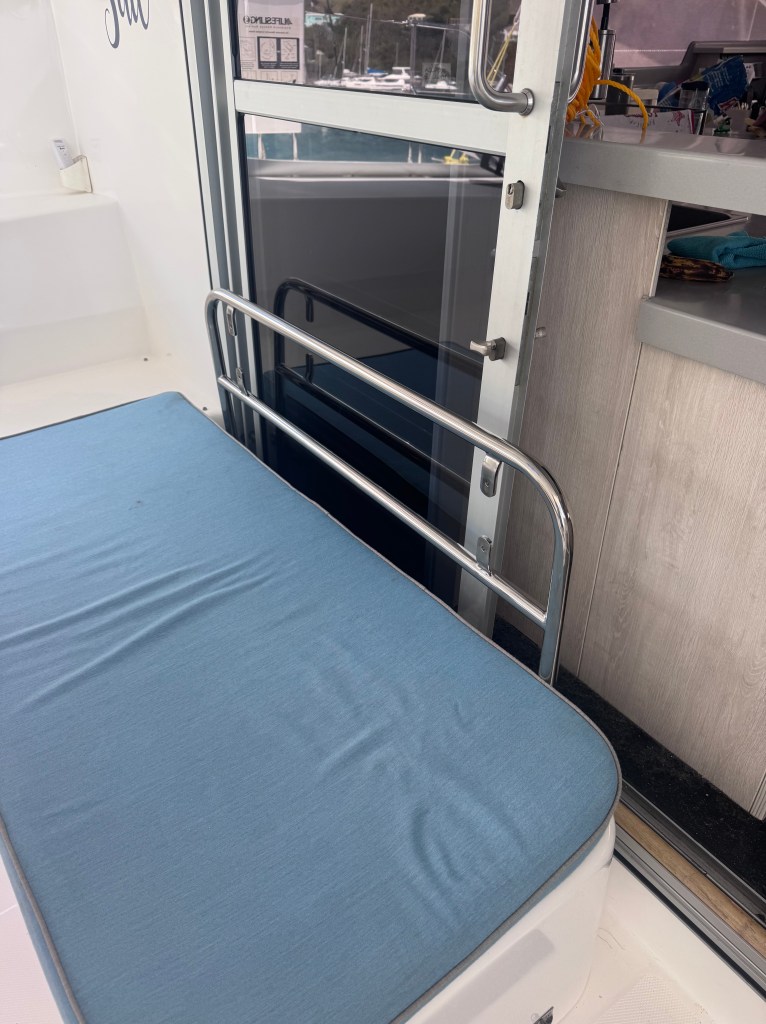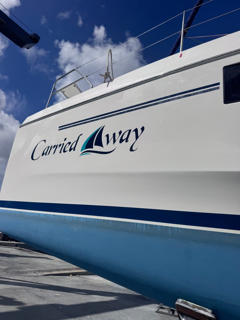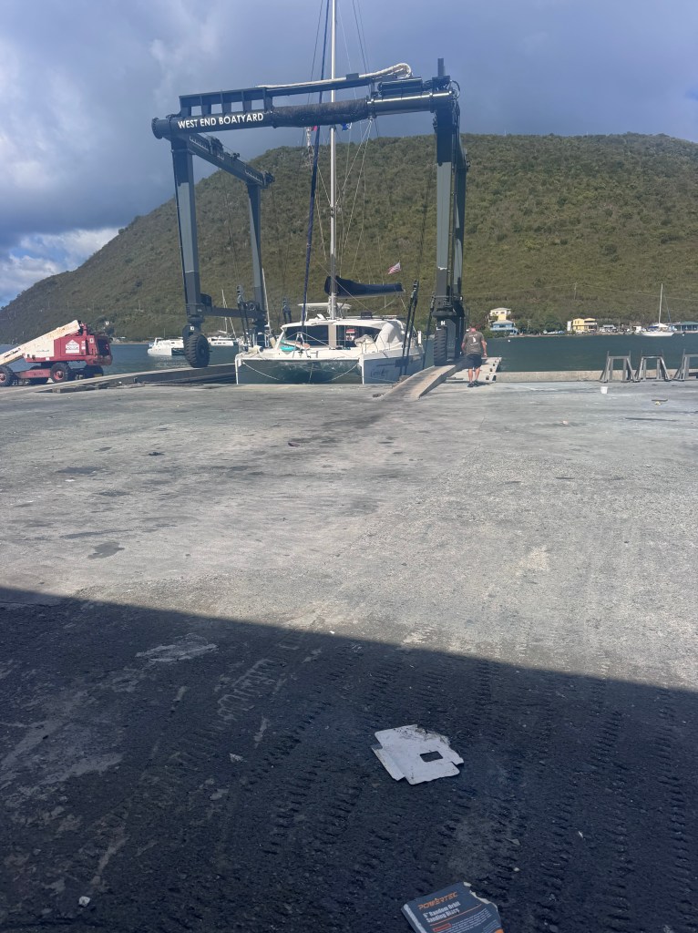 We had the boat hauled in Sopers Hole Tortola for what we hope to be the “third time is a charm” resetting of the rudder posts. And while she was “up on the hard” we also had them give the hull a nice clean and polish. We love the West End Boatyard – the owner Sharn is terrific. One small project we had been thinking about was adding a back rest to the cockpit seating area. Sharn helped organize all of it – really quickly. He got his friend Cleatus who runs a metal shop in Road Town to make the support within a week. We then worked with Doyle to design the cushion which required getting a piece of Starboard from a local manufacturer – who cut and had it ready in 15 minutes! It was a blast driving around to all the local purveyors to get it done. The cushion will take some time to make so we’ll stop back in late February to pick that up.
